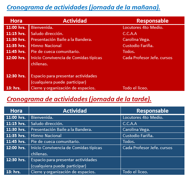 A continuación lo invitamos a visualizar nuestro cronograma de fiestas patrias.
